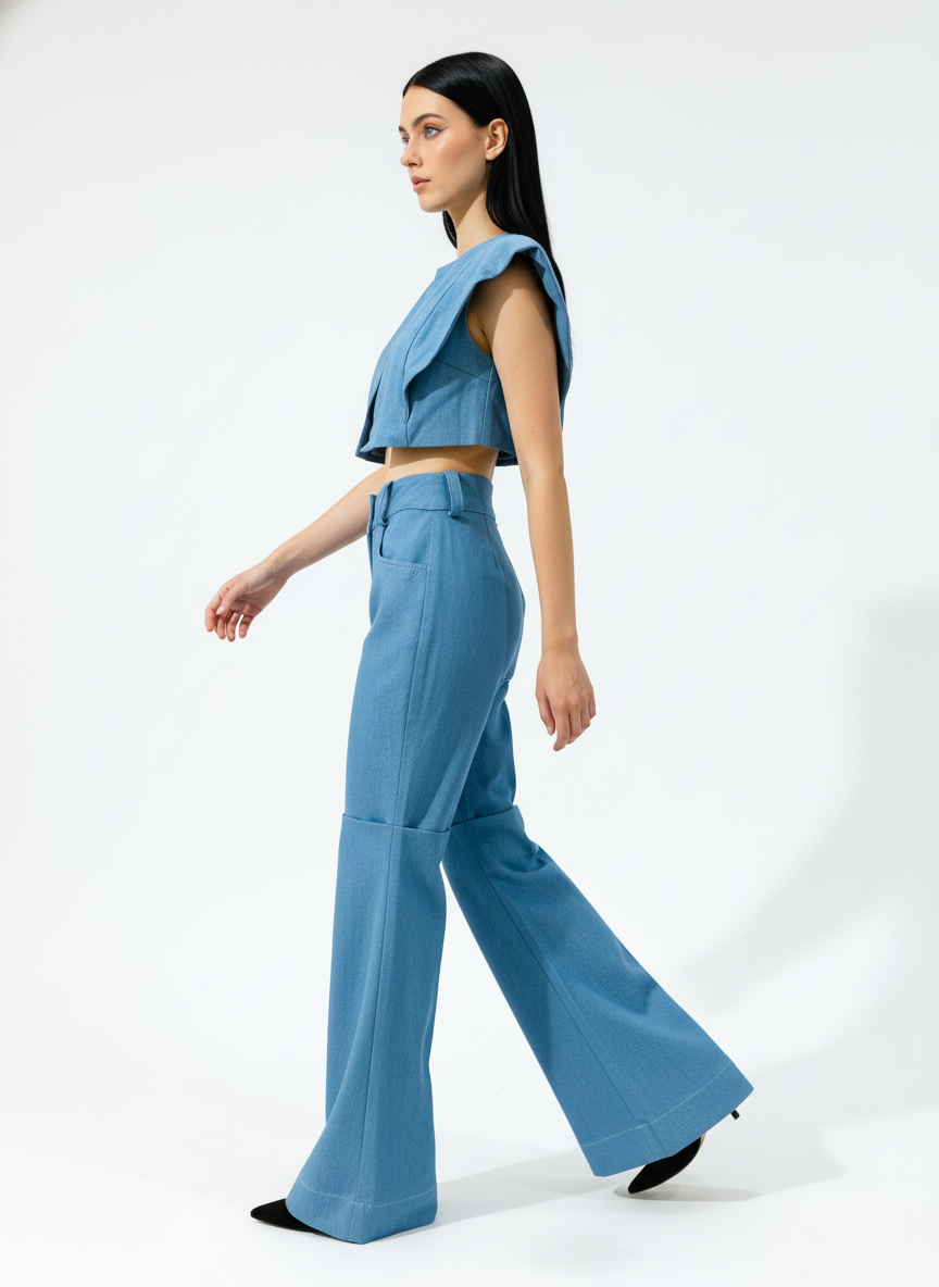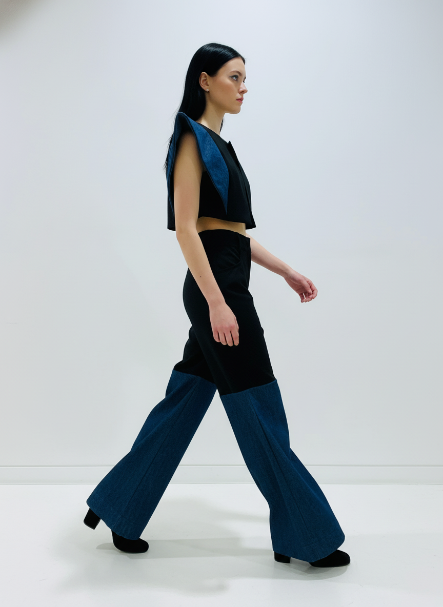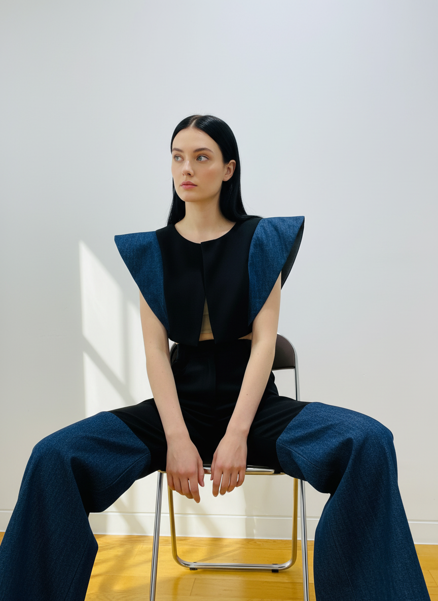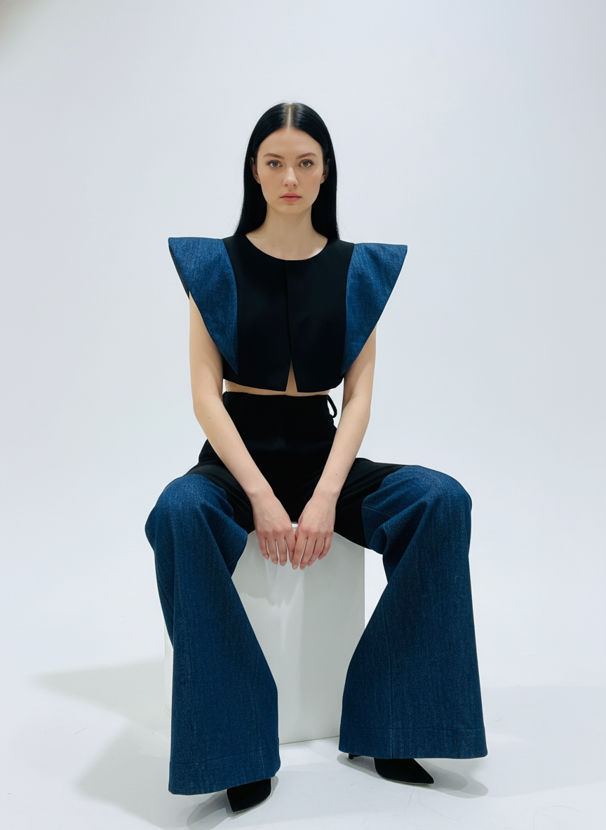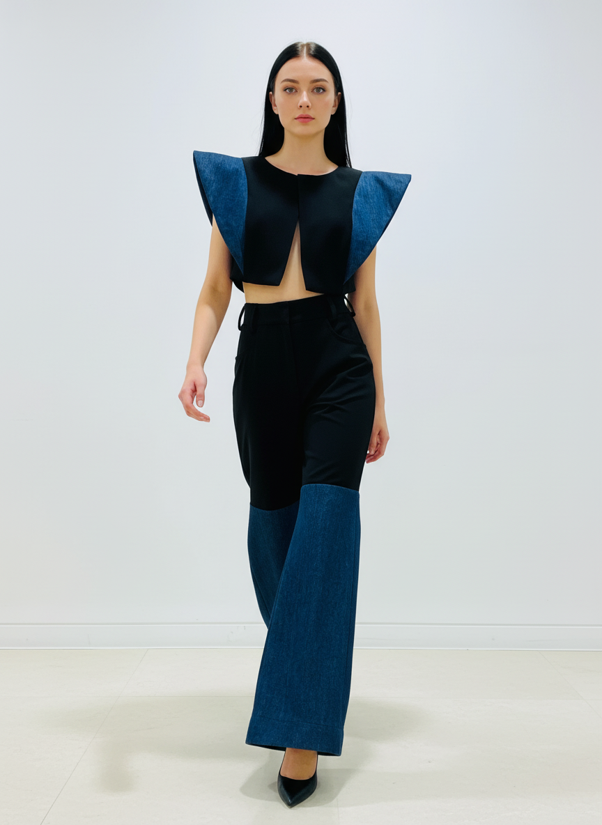 A bold fusion of structure and texture. This two-piece set is designed for the high-fashion enthusiast, blending smooth, tailored Lycra Merino Wool with classic Denim to create an unforgettable, angular silhouette. The top features dramatic, oversized cap sleeves, perfectly balanced by the wide-leg, two-tone pants.
